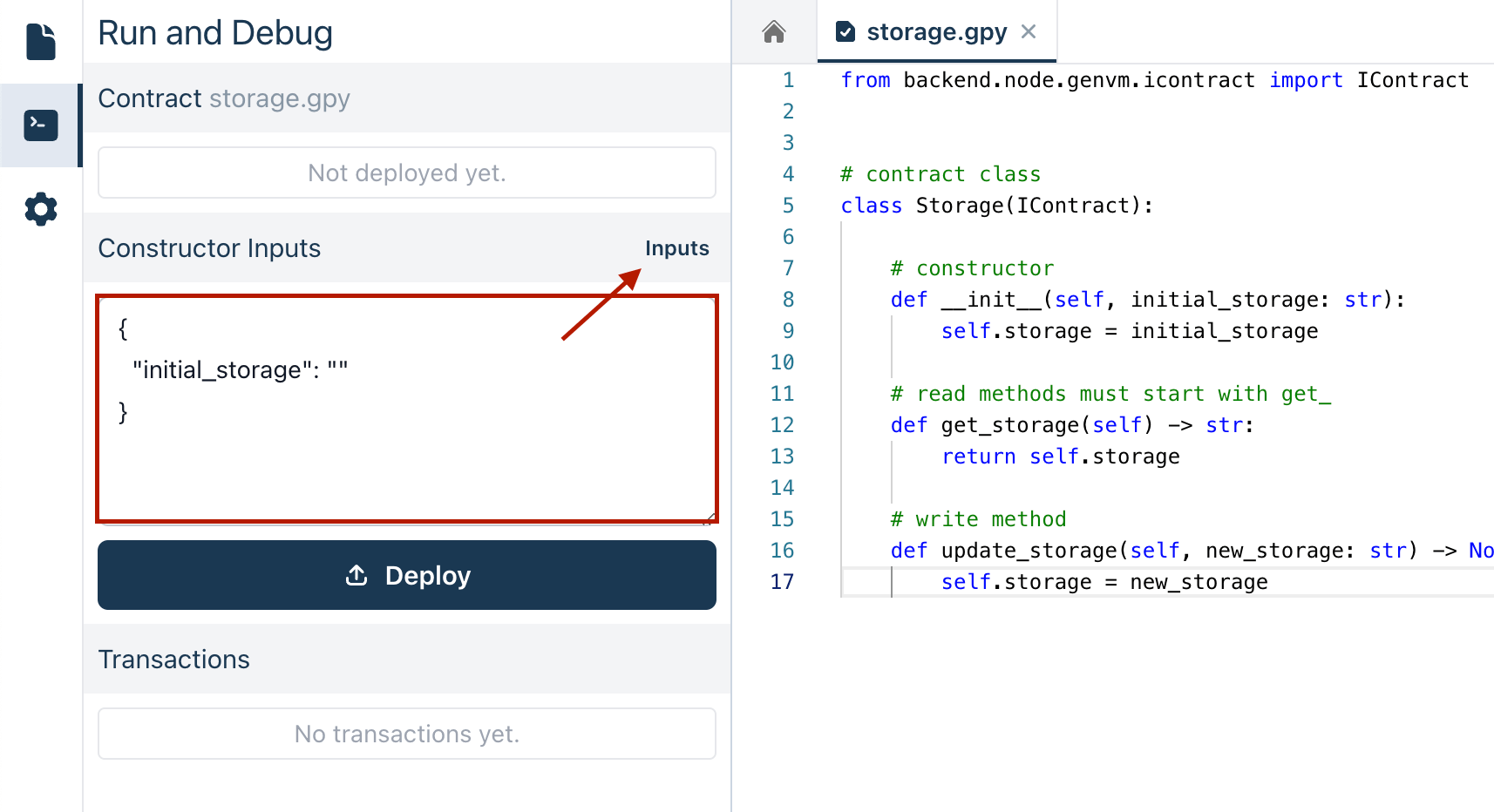The GenLayer Studio automatically detects the constructor parameters from your code. It analyzes your __init__ method to identify the parameters and their types. This automatic detection ensures that you have the correct inputs for initializing your contract. It’s important to have clear type annotations for each parameter (e.g., str, bool, int, list) to enable accurate detection.