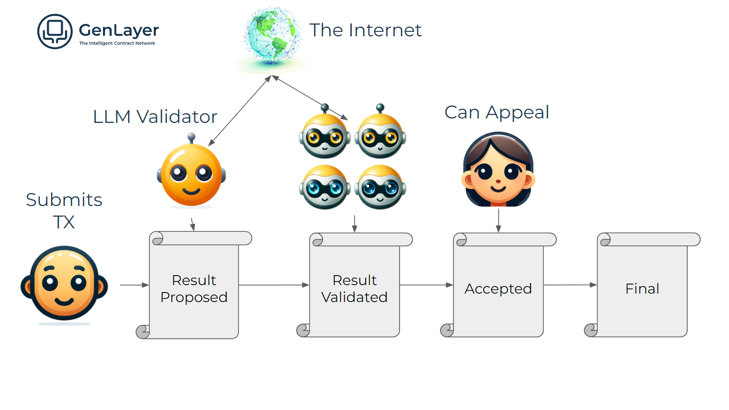 In other words, GenLayer is the first Intelligent Blockchain. Enabling smart contracts to natively access the Internet and go beyond deterministic logic, to make subjective decisions.